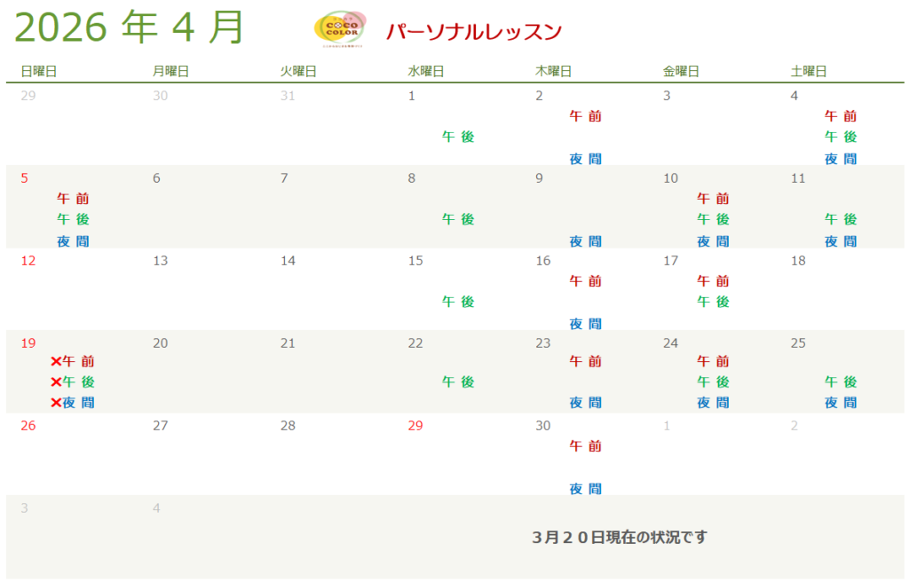 レッスンは午前、午後、夜間で各1名ずつの予約枠です。