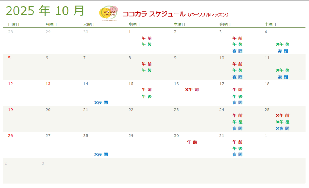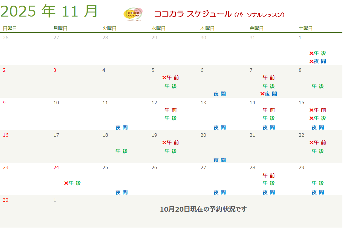 レッスンは午前、午後、夜間で各1名ずつの予約枠です。